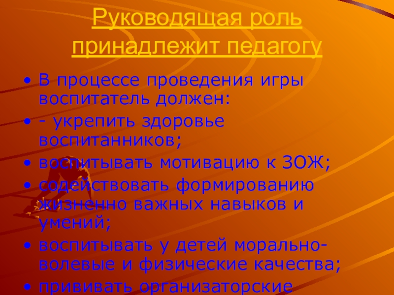 Включая в план ту или иную игру, воспитатель или инструктор по ФК должен знать, какие качества и навыки он может развить и закрепить с её помощью: в одной игре преобладает бег, а в другой -- метание, в одной от детей требуется выдержка., а в другой -- ловкость и т. д.