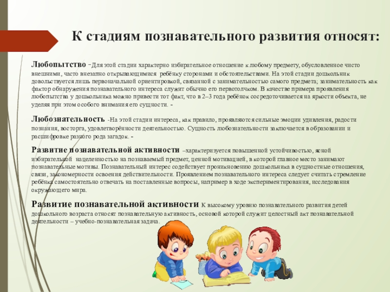 Любопытство -Для этой стадии характерно избирательное отношение к любому предмету, обусловленное чисто внешними, часто внезапно открывающимися ребёнку сторонами и обстоятельствами. На этой стадии дошкольник довольствуется лишь первоначальной ориентировкой, связанной с занимательностью самого предмета; занимательность как фактор обнаружения познавательного интереса служит обычно его первотолчком. В качестве примера проявления любопытства у дошкольника можно привести тот факт, что в 2–3 года ребёнок сосредоточивается на яркости объекта, не уделяя при этом особого внимания его сущности. -