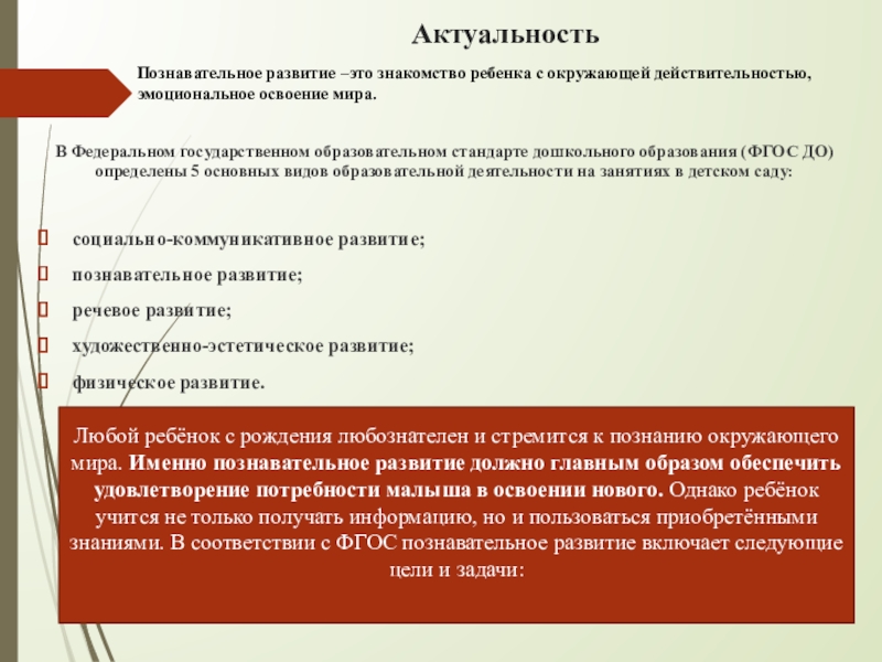 Познавательное развитие –это знакомство ребенка с окружающей действительностью, эмоциональное освоение мира.