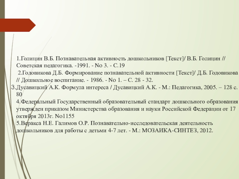 1.Голицин В.Б. Познавательная активность дошкольников [Текст]/ В.Б. Голицин // Советская педагогика.
