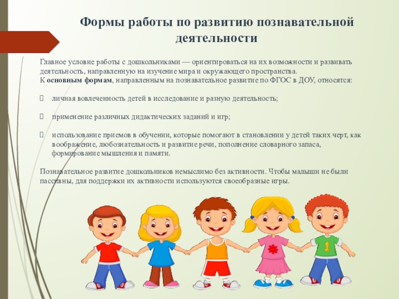 К основным формам, направленным на познавательное развитие по ФГОС в ДОУ, относятся: