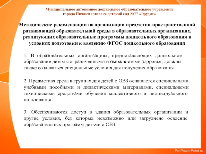 1. В образовательных организациях, предоставляющих дошкольное образование детям с ограниченными возможностями здоровья, должны также создаваться специальные условия для получения образования.