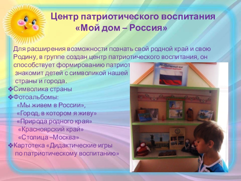 Для расширения возможности познать свой родной край и свою Родину, в группе создан центр патриотического воспитания, он способствует формированию патриотических чувств,