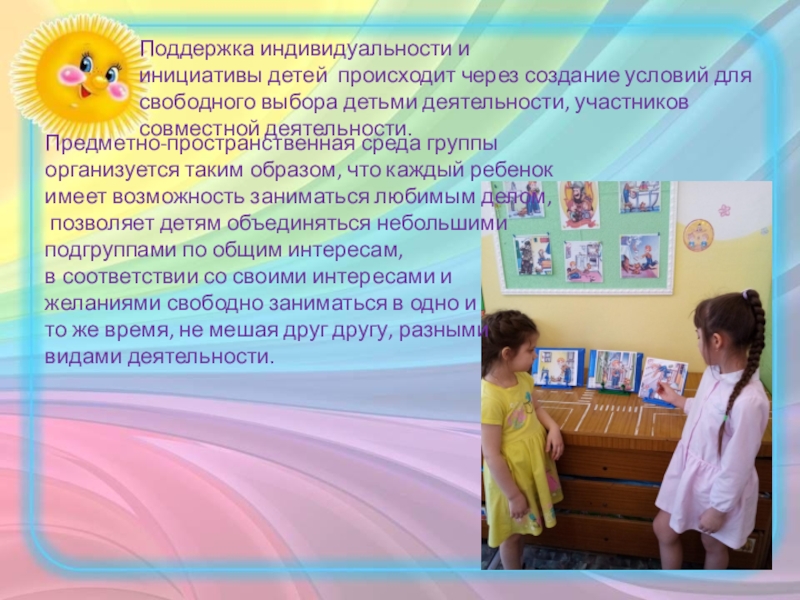 Слайд 23Поддержка индивидуальности и инициативы детей происходит через создание условий для свободного выбора