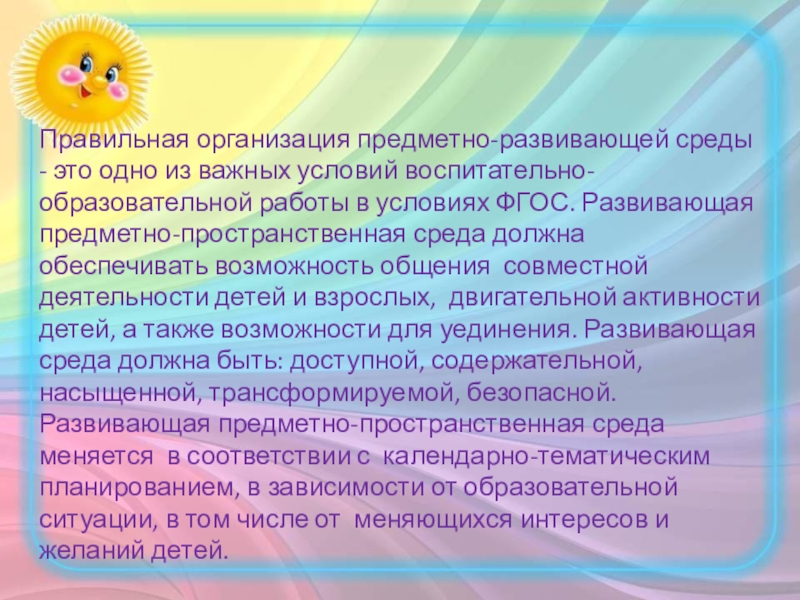 работы в условиях ФГОС. Развивающая предметно-пространственная среда должна обеспечивать возможность общения совместной деятельности детей и взрослых, двигательной активности детей, а также возможности для уединения. Развивающая среда должна быть: доступной, содержательной, насыщенной, трансформируемой, безопасной. Развивающая предметно-пространственная среда меняется в соответствии с календарно-тематическим планированием, в зависимости от образовательной ситуации, в том числе от меняющихся интересов и желаний детей.