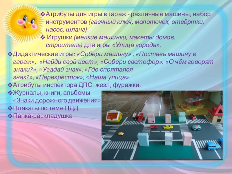 Дидактические игры: «Собери машину» , «Поставь машину в гараж», «Найди свой цвет», «Собери светофор», «О чём говорят знаки?», «Угадай знак», «Где спрятался знак?», «Перекрёсток», «Наша улица».