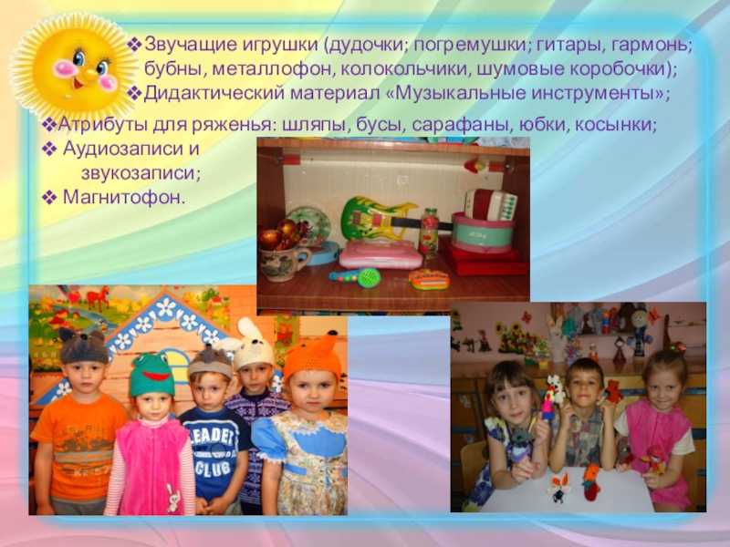Слайд 20Звучащие игрушки (дудочки; погремушки; гитары, гармонь;