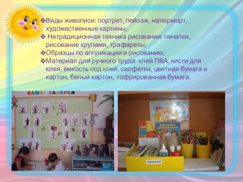 Слайд 14Материал для рисования: альбомы, гуашевые краски, простые и цветные карандаши, восковые