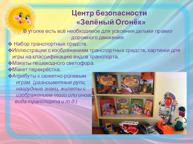 Слайд 16В уголке есть всё необходимое для усвоения детьми правил дорожного движения: