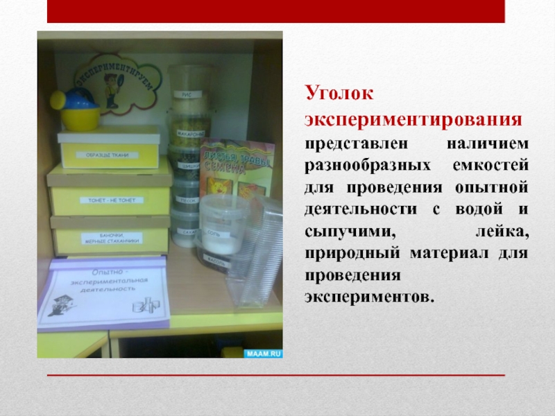 Слайд 15Уголок экспериментирования представлен наличием разнообразных емкостей для проведения опытной деятельности с