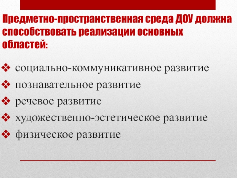 Предметно-пространственная среда ДОУ должна способствовать реализации основных