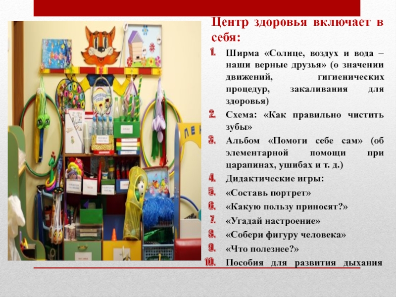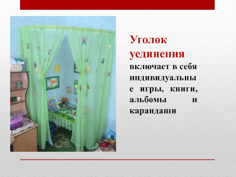 Слайд 12Уголок уединения включает в себя индивидуальные игры, книги, альбомы и карандаши