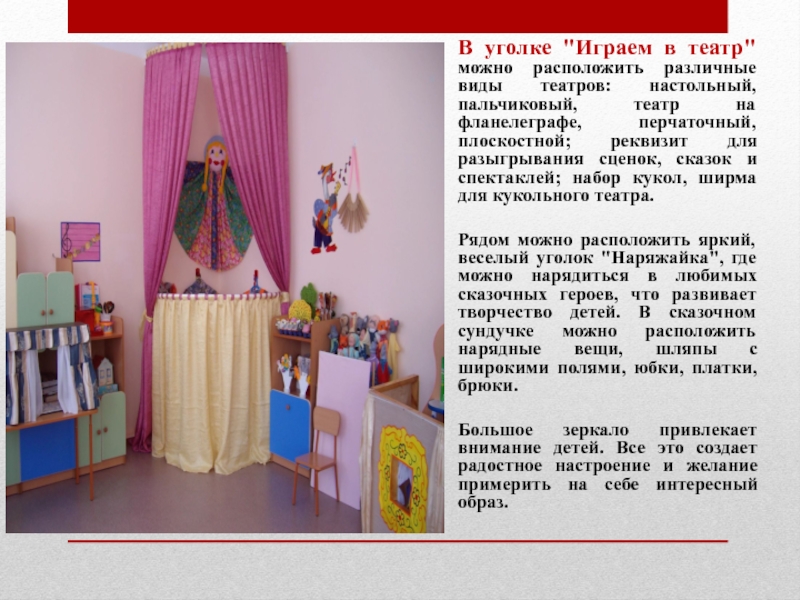 Слайд 22В уголке "Играем в театр" можно расположить различные виды театров: настольный,