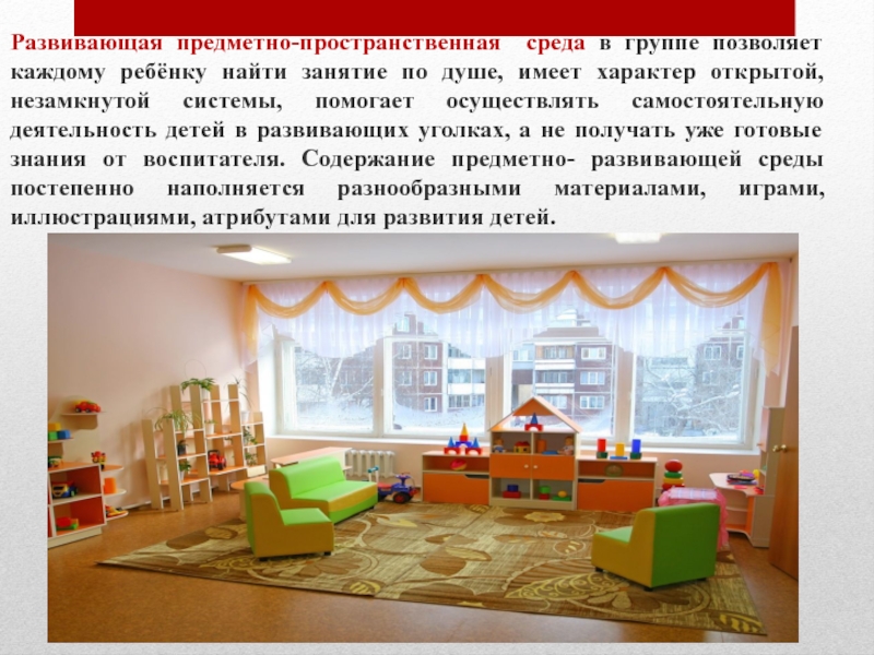 душе, имеет характер открытой, незамкнутой системы, помогает осуществлять самостоятельную деятельность детей в развивающих уголках, а не получать уже готовые знания от воспитателя. Содержание предметно- развивающей среды постепенно наполняется разнообразными материалами, играми, иллюстрациями, атрибутами для развития детей.