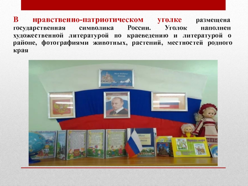 Слайд 7В нравственно-патриотическом уголке размещена государственная символика России. Уголок наполнен художественной литературой