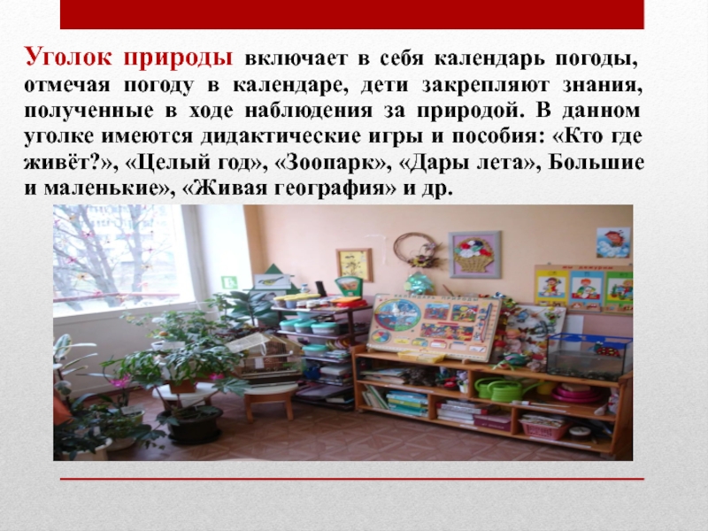 дети закрепляют знания, полученные в ходе наблюдения за природой. В данном уголке имеются дидактические игры и пособия: «Кто где живёт?», «Целый год», «Зоопарк», «Дары лета», Большие и маленькие», «Живая география» и др.