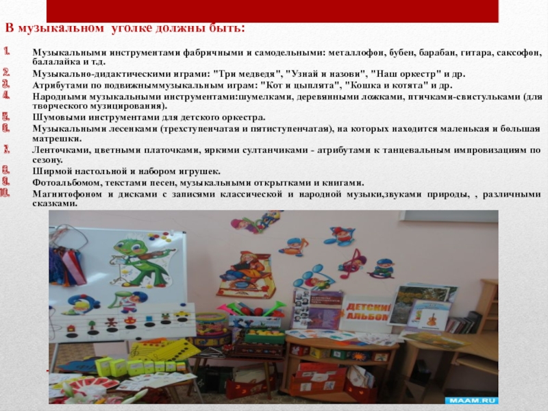 Слайд 23В музыкальном уголке должны быть: