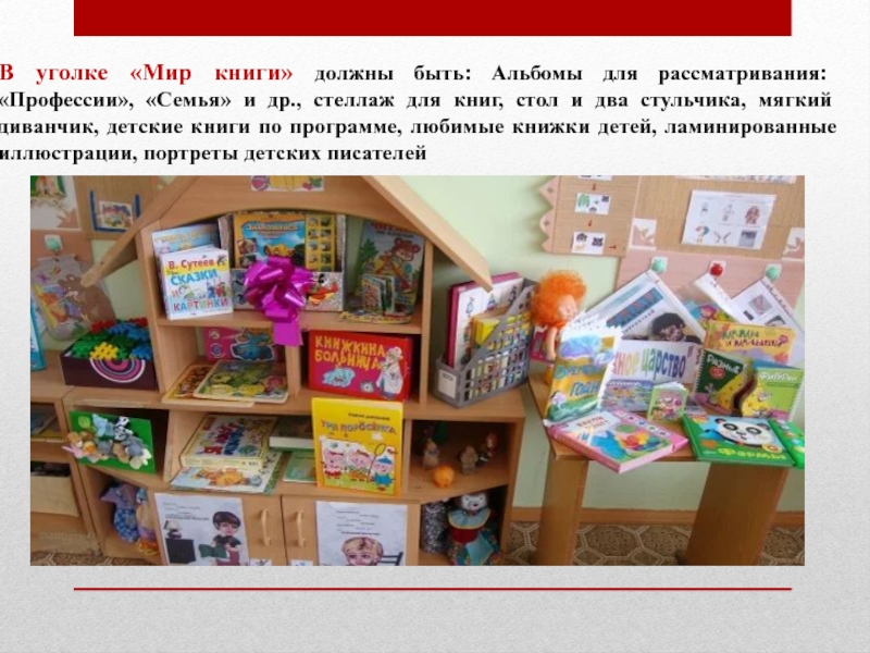 Слайд 19В уголке «Мир книги» должны быть: Альбомы для рассматривания: «Профессии», «Семья»