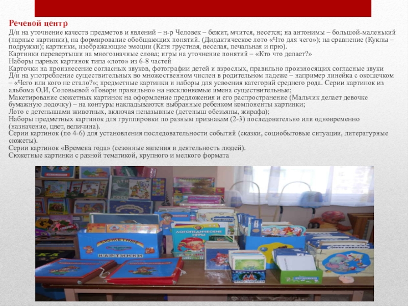 – бежит, мчится, несется; на антонимы – большой-маленький (парные картинки), на формирование обобщающих понятий. (Дидактическое лото «Что для чего»); на сравнение (Куклы – подружки); картинки, изображающие эмоции (Катя грустная, веселая, печальная и прю).