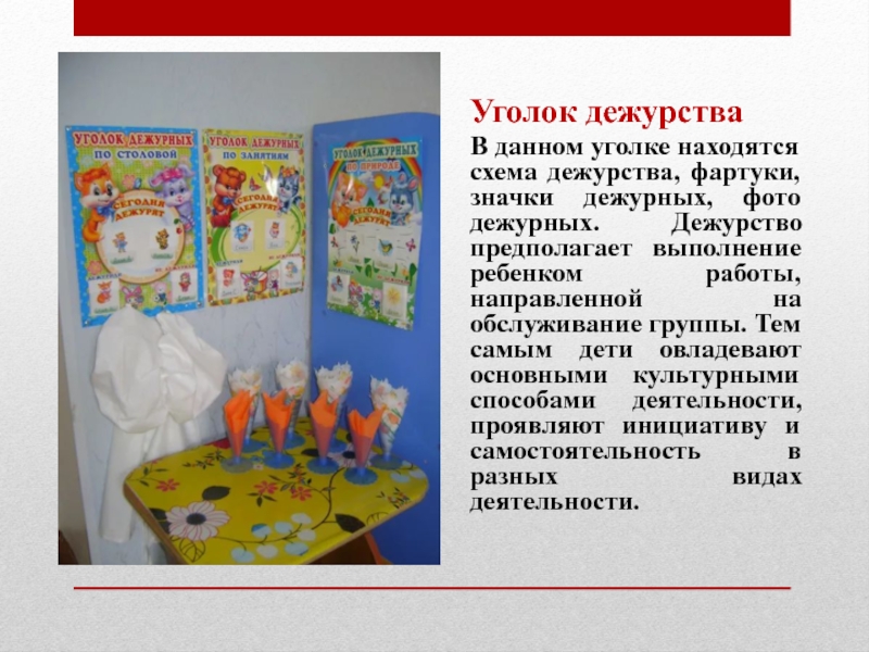 В данном уголке находятся схема дежурства, фартуки, значки дежурных, фото