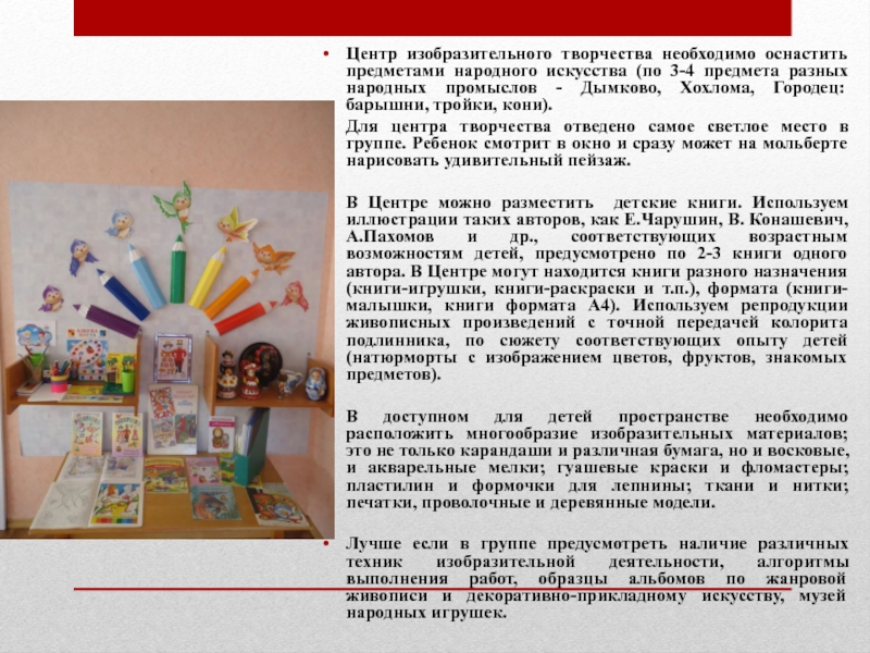 Слайд 24Центр изобразительного творчества необходимо оснастить предметами народного искусства (по 3-4 предмета