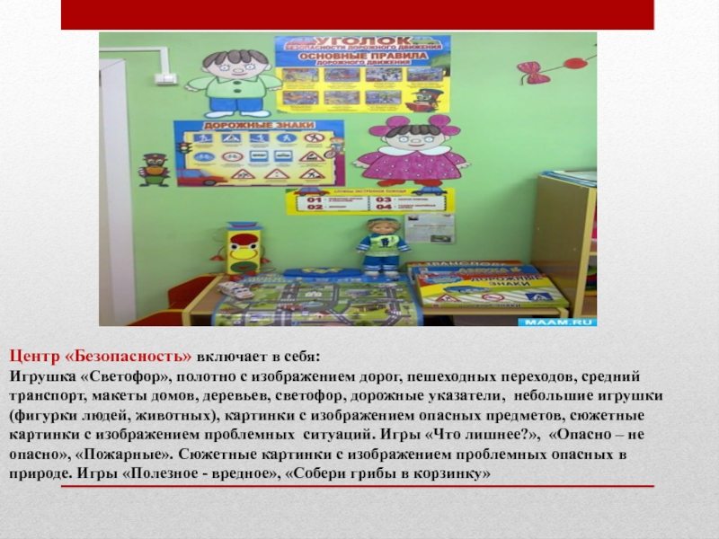 переходов, средний транспорт, макеты домов, деревьев, светофор, дорожные указатели, небольшие игрушки (фигурки людей, животных), картинки с изображением опасных предметов, сюжетные картинки с изображением проблемных ситуаций. Игры «Что лишнее?», «Опасно – не опасно», «Пожарные». Сюжетные картинки с изображением проблемных опасных в природе. Игры «Полезное - вредное», «Собери грибы в корзинку»