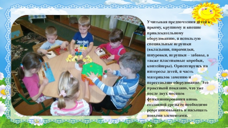 использую специальные игрушки (вкладыши, пирамидки, шнуровки, игрушки – забавы, а также пластиковые коробки, контейнеры). Ориентируясь на интересы детей, я часть материалов заменяю и переставляю оборудование. Это практикой показано, что уже после двух месяцев функционирования вновь созданной среды ее необходимо реорганизовывать и насыщать новыми элементами.