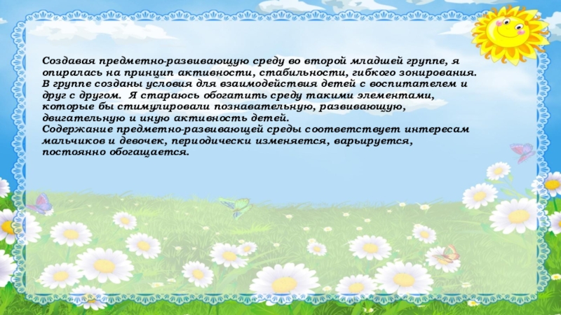 Слайд 4Создавая предметно-развивающую среду во второй младшей группе, я опиралась на принцип