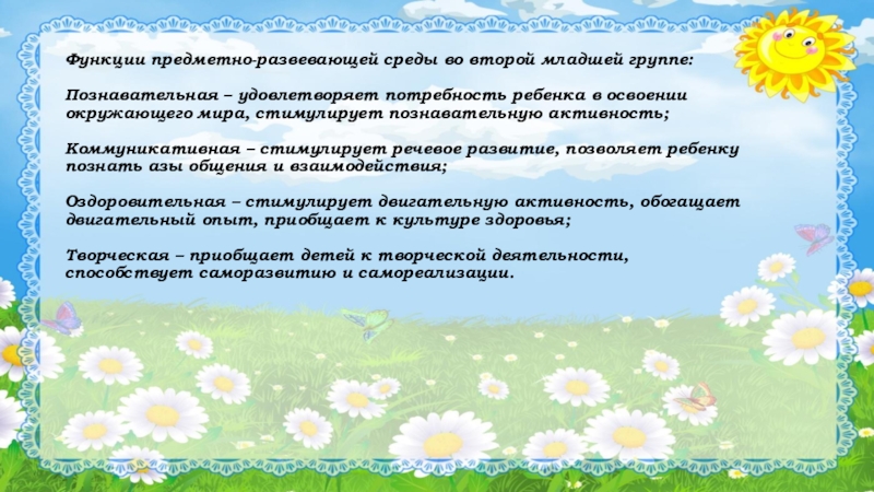 Слайд 5Функции предметно-развевающей среды во второй младшей группе: