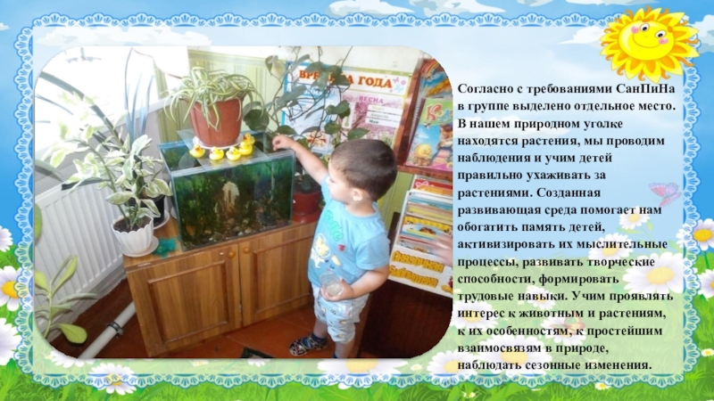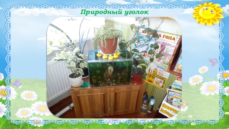 природном уголке находятся растения, мы проводим наблюдения и учим детей правильно ухаживать за растениями. Созданная развивающая среда помогает нам обогатить память детей, активизировать их мыслительные процессы, развивать творческие способности, формировать трудовые навыки. Учим проявлять интерес к животным и растениям, к их особенностям, к простейшим взаимосвязям в природе, наблюдать сезонные изменения.