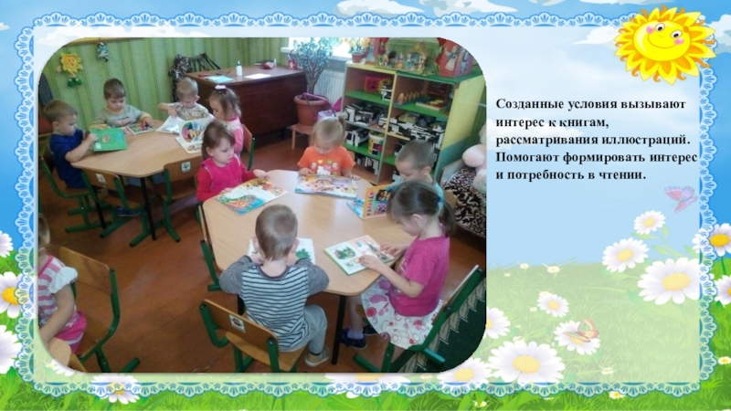 Слайд 29Созданные условия вызывают интерес к книгам, рассматривания иллюстраций. Помогают формировать интерес