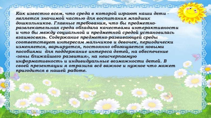 является значимой частью для воспитания младших дошкольников. Главные требования, что бы предметно-развлекательная среда обладала качествами интерактивности и что бы между социальной и предметной средой установилась взаимосвязь. Содержание предметно-развивающей среды соответствует интересам мальчиков и девочек, периодически изменяется, варьируется, постоянно обогащается новыми пособиями для поддержание интереса детей, на обеспечение «зоны ближайшего развития», на неисчерпаемую информативность и индивидуальные возможности детей. В своей презентации я отразила всё важное и нужное что может пригодится в нашей работе.