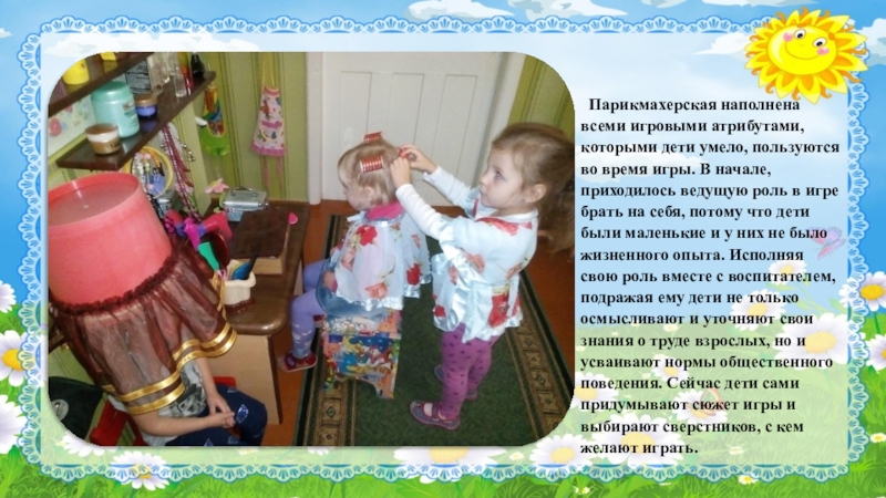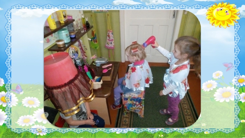 Слайд 17 Парикмахерская наполнена всеми игровыми атрибутами, которыми дети умело, пользуются во время