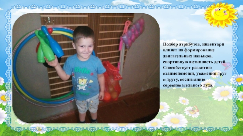 Слайд 41Подбор атрибутов, инвентаря влияет на формирование двигательных навыков, спортивную активность детей.