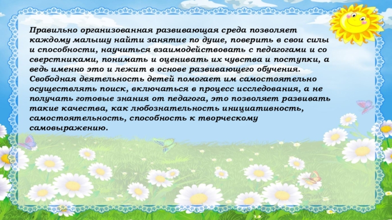 Слайд 3Правильно организованная развивающая среда позволяет каждому малышу найти занятие по душе,