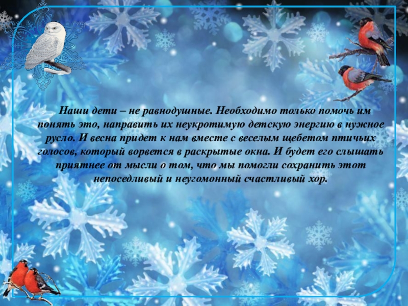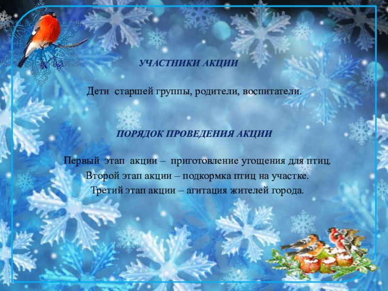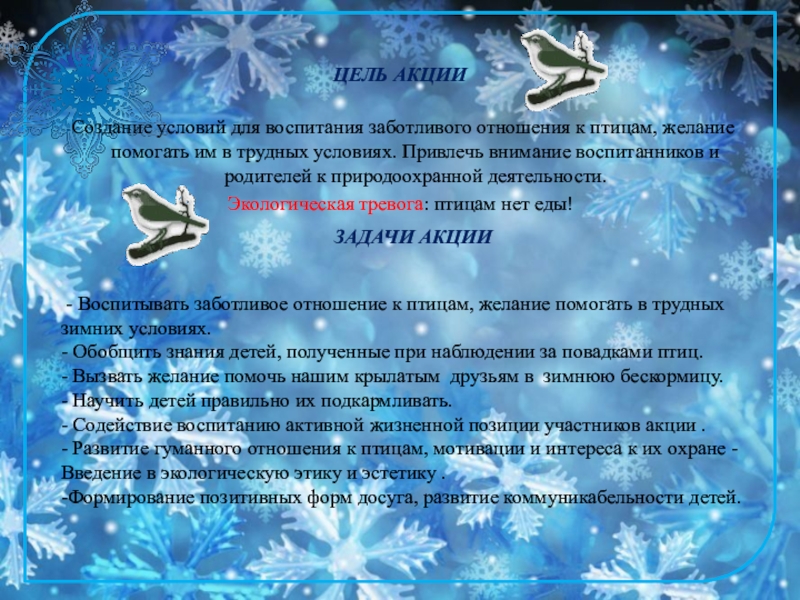 - Воспитывать заботливое отношение к птицам, желание помогать в трудных зимних условиях.