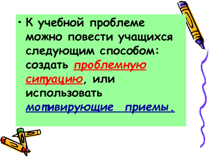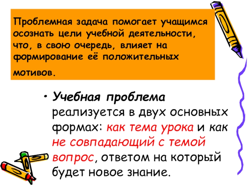 Учебная проблема реализуется в двух основных формах: как тема урока и как не совпадающий с темой вопрос, ответом на который будет новое знание.