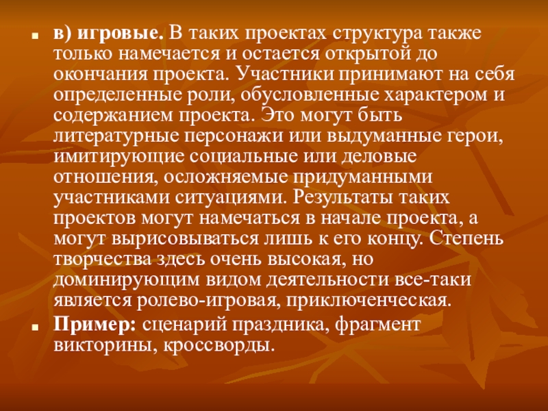 Слайд 10в) игровые. В таких проектах структура также только намечается и остается