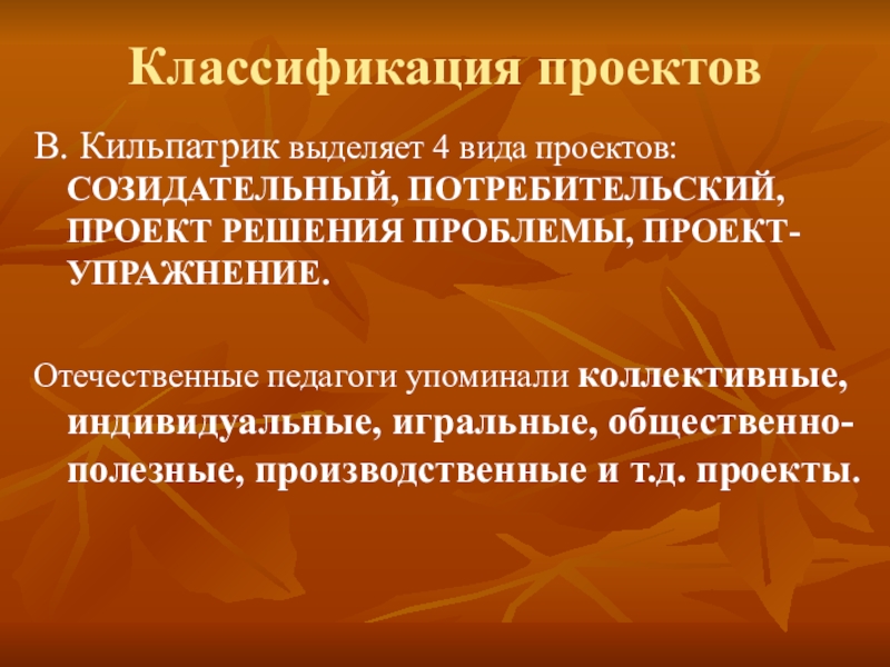 В. Кильпатрик выделяет 4 вида проектов: СОЗИДАТЕЛЬНЫЙ, ПОТРЕБИТЕЛЬСКИЙ, ПРОЕКТ
