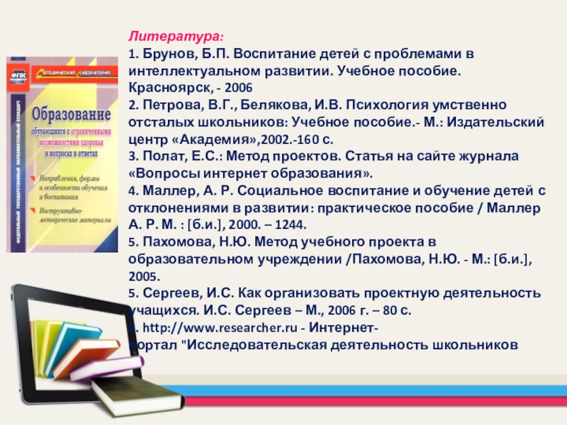 1. Брунов, Б.П. Воспитание детей с проблемами в интеллектуальном развитии. Учебное