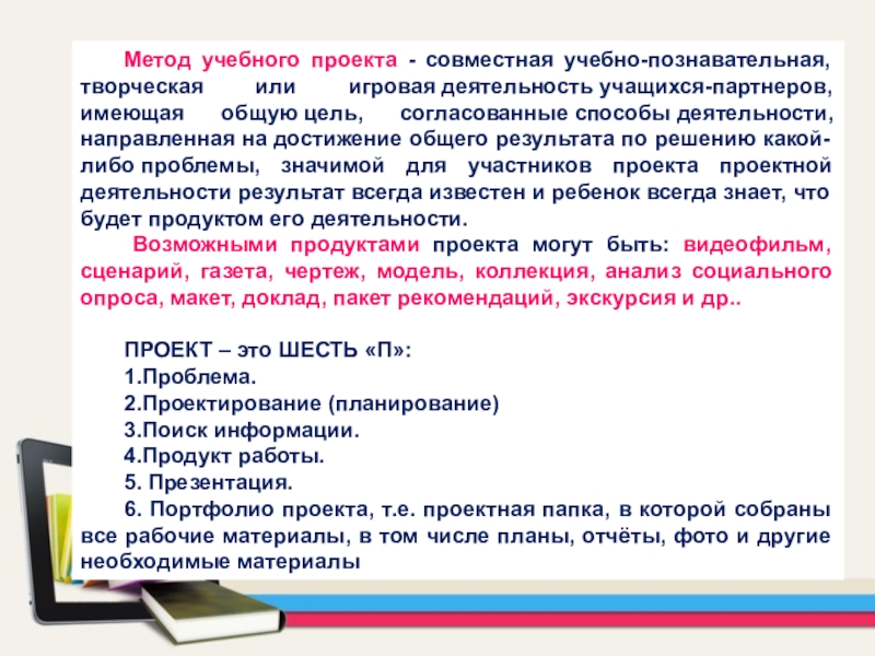 согласованные способы деятельности, направленная на достижение общего результата по решению какой-либо проблемы, значимой для участников проекта проектной деятельности результат всегда известен и ребенок всегда знает, что будет продуктом его деятельности.