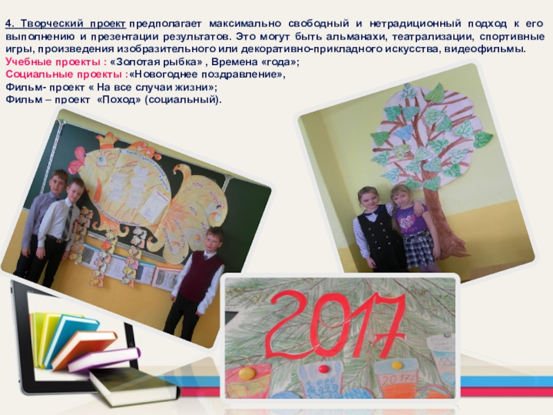 и презентации результатов. Это могут быть альманахи, театрализации, спортивные игры, произведения изобразительного или декоративно-прикладного искусства, видеофильмы.