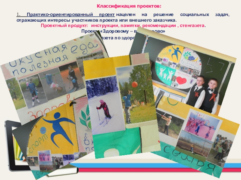Возможными продуктами проекта могут быть: видеофильм, сценарий, газета, чертеж, модель, коллекция, анализ социального опроса, макет, доклад, пакет рекомендаций, экскурсия и др..