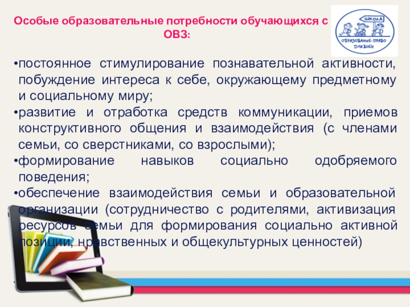 Слайд 6Особые образовательные потребности обучающихся с ОВЗ: