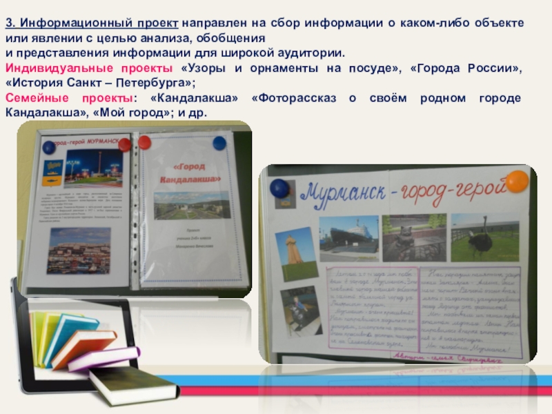 Семейные проекты: «Кандалакша» «Фоторассказ о своём родном городе Кандалакша», «Мой город»; и др.