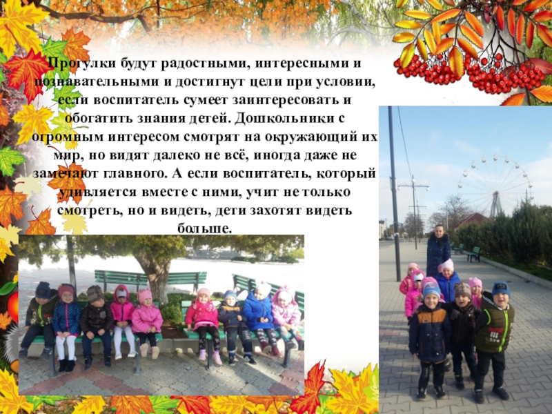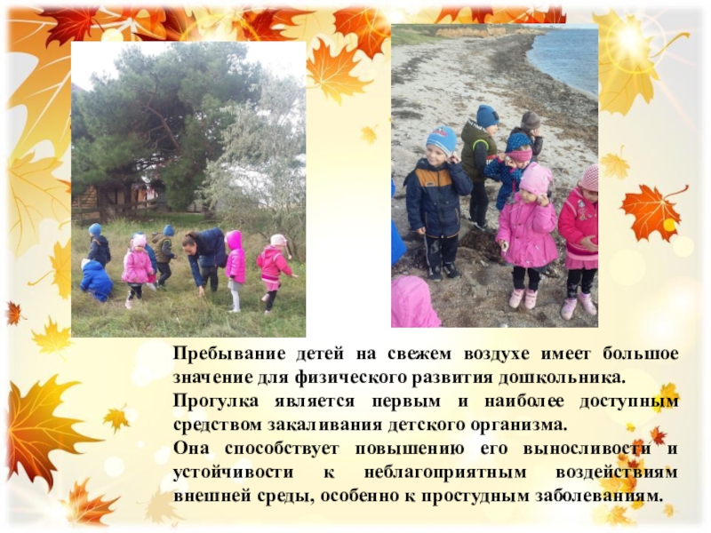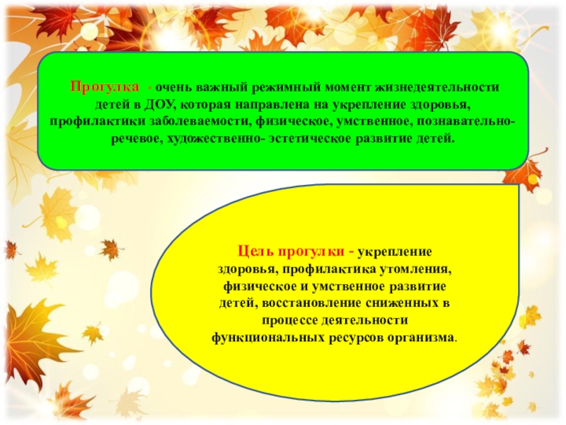 Цель прогулки - укрепление здоровья, профилактика утомления, физическое и умственное развитие детей, восстановление сниженных в процессе деятельности функциональных ресурсов организма.