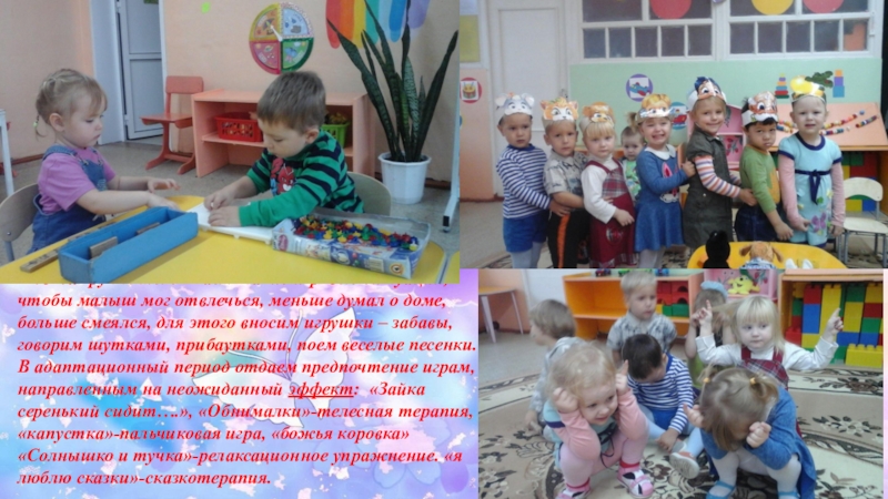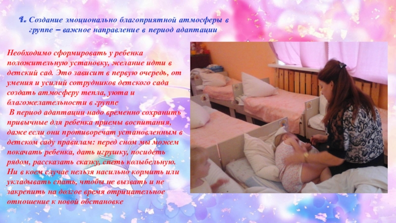 В период адаптации надо временно сохранить привычные для ребенка приемы воспитания, даже если они противоречат установленным в детском саду правилам: перед сном мы можем покачать ребенка, дать игрушку, посидеть рядом, рассказать сказку, спеть колыбельную. Ни в коем случае нельзя насильно кормить или укладывать спать, чтобы не вызвать и не закрепить на долгое время отрицательное отношение к новой обстановке