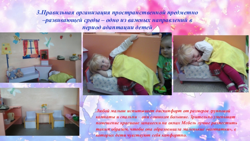 Любой малыш испытывает дискомфорт от размеров групповой комнаты и спальни – они слишком большие. Зрительно уменьшат помещение красивые занавески на окнах Мебель лучше разместить таким образом, чтобы она образовывала маленькие «комнатки», в которых дети чувствуют себя комфортно.