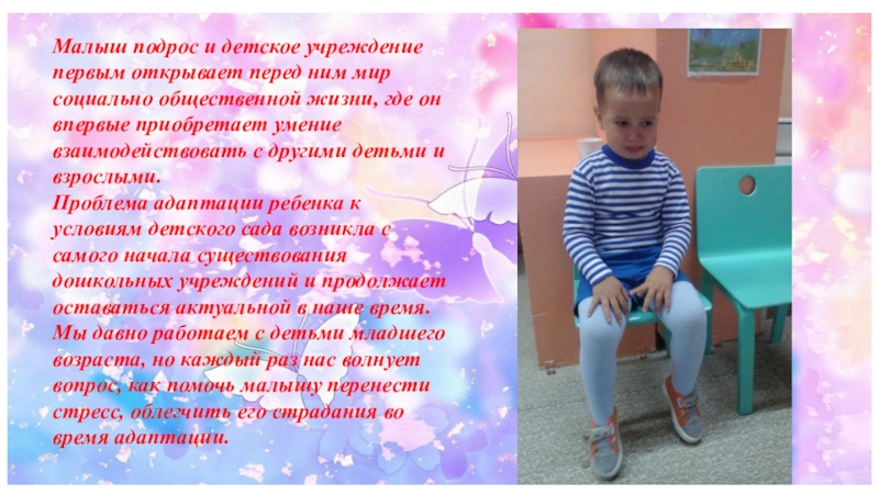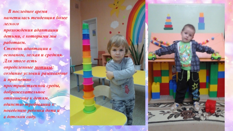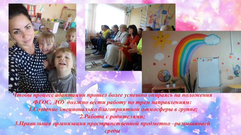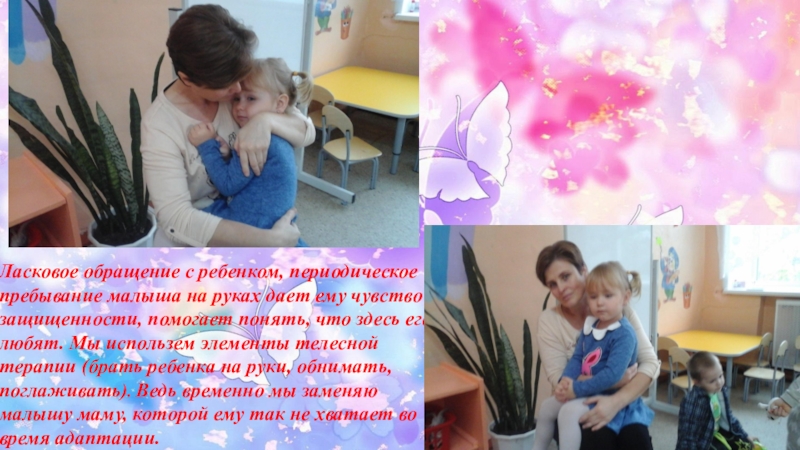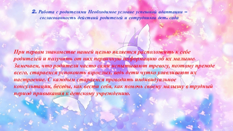 При первом знакомстве нашей целью является расположить к себе родителей и получить от них первичную информацию об их малыше. Замечаем, что родители часто сами испытывают тревогу, поэтому прежде всего, стараемся успокоить взрослых, ведь дети чутко улавливают их настроение. С каждым стараемся проводить индивидуальное консультации, беседы, как вести себя, как помочь своему малышу в трудный период привыкания к детскому учреждению.