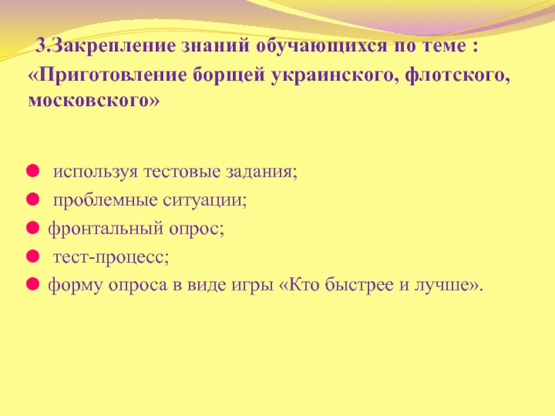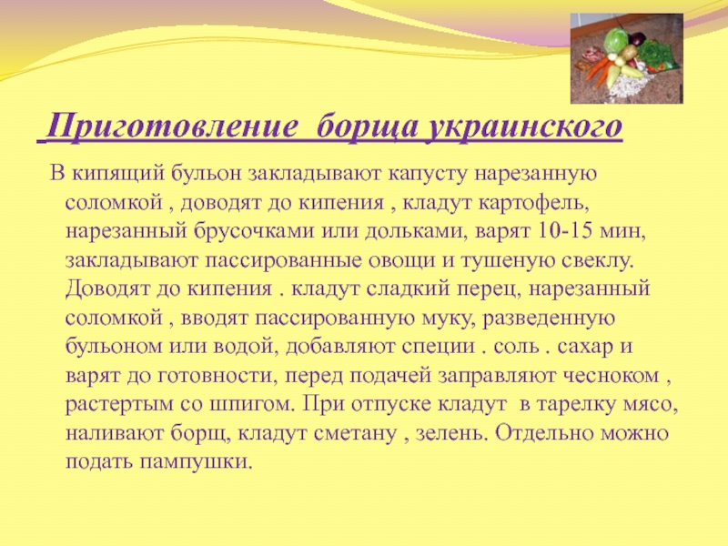 Слайд 8 3.Закрепление знаний обучающихся по теме : «Приготовление борщей украинского, флотского,